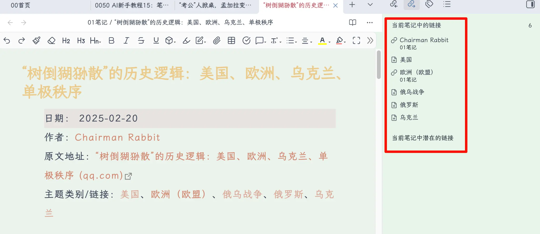 举个例子:这个教程系列的文章,就是我把Obsidian里平时积累的素材交给AI,一起完成的。没有素材库,光靠AI从零开始写,质量会差很多。