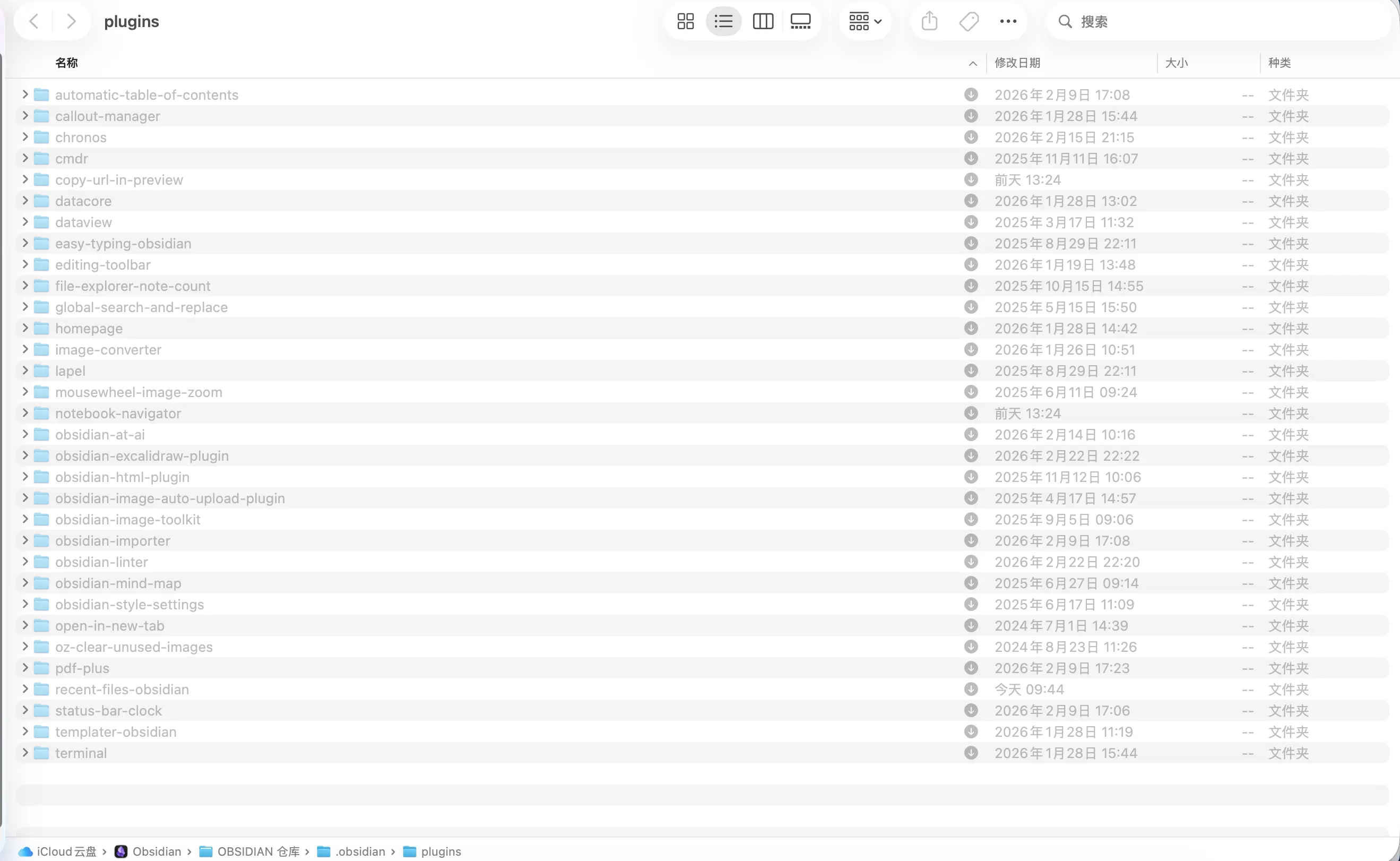 在你的库文件夹里找到 .obsidian/plugins/ 目录(没有就新建一个)。在里面创建一个文件夹,把下载的文件放进去: