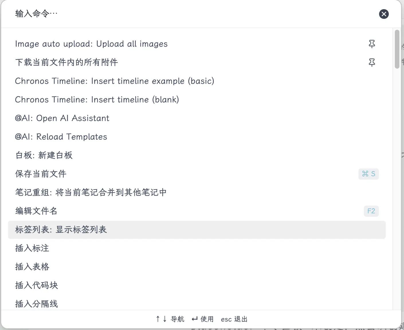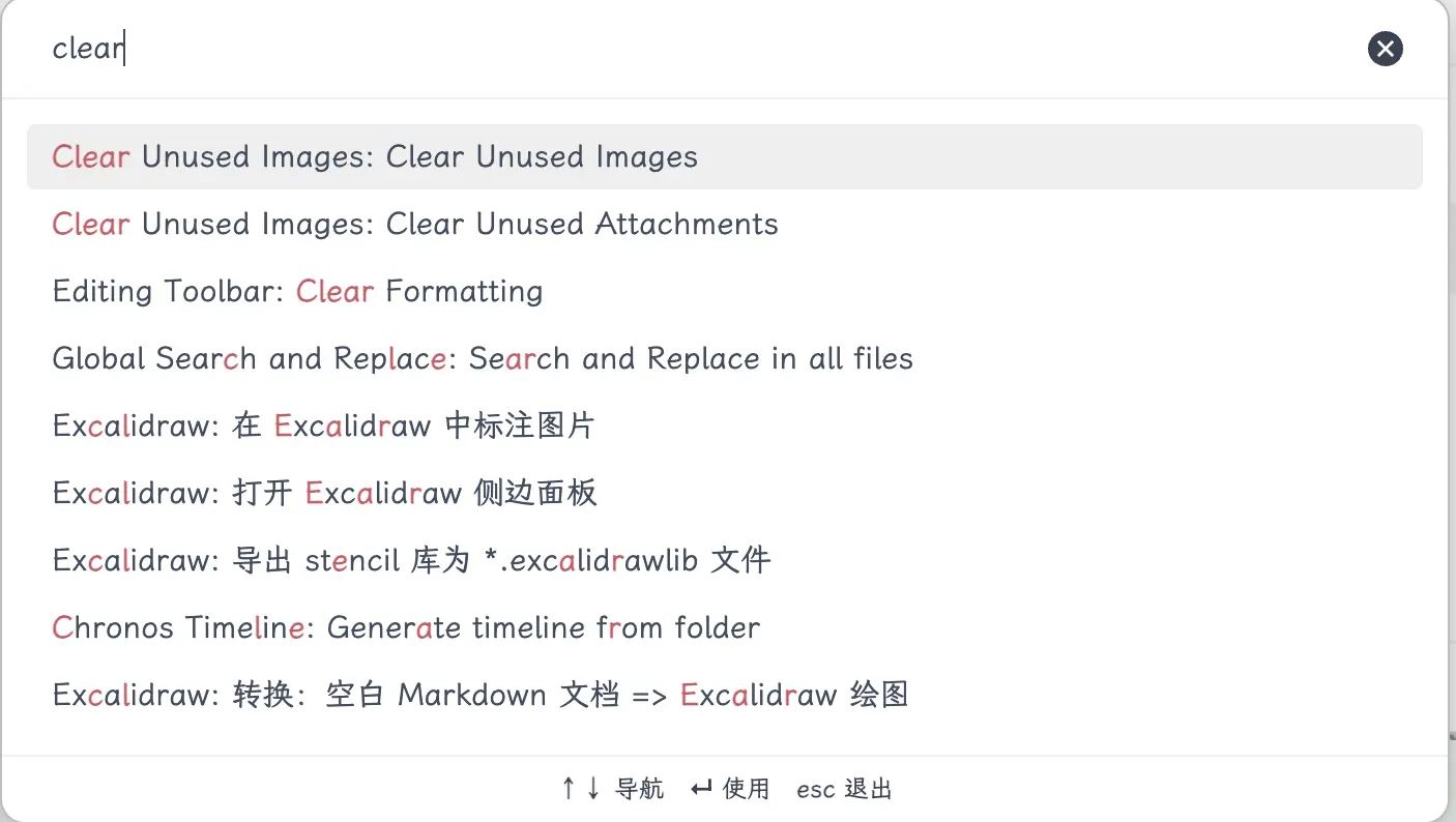 几乎所有插件的功能都能通过命令面板调用。不记得某个功能在哪?Ctrl/Cmd + P 搜一下就行。比如想清理没用的图片,不用去找按钮,直接命令面板输入"Clear"就能找到对应操作。