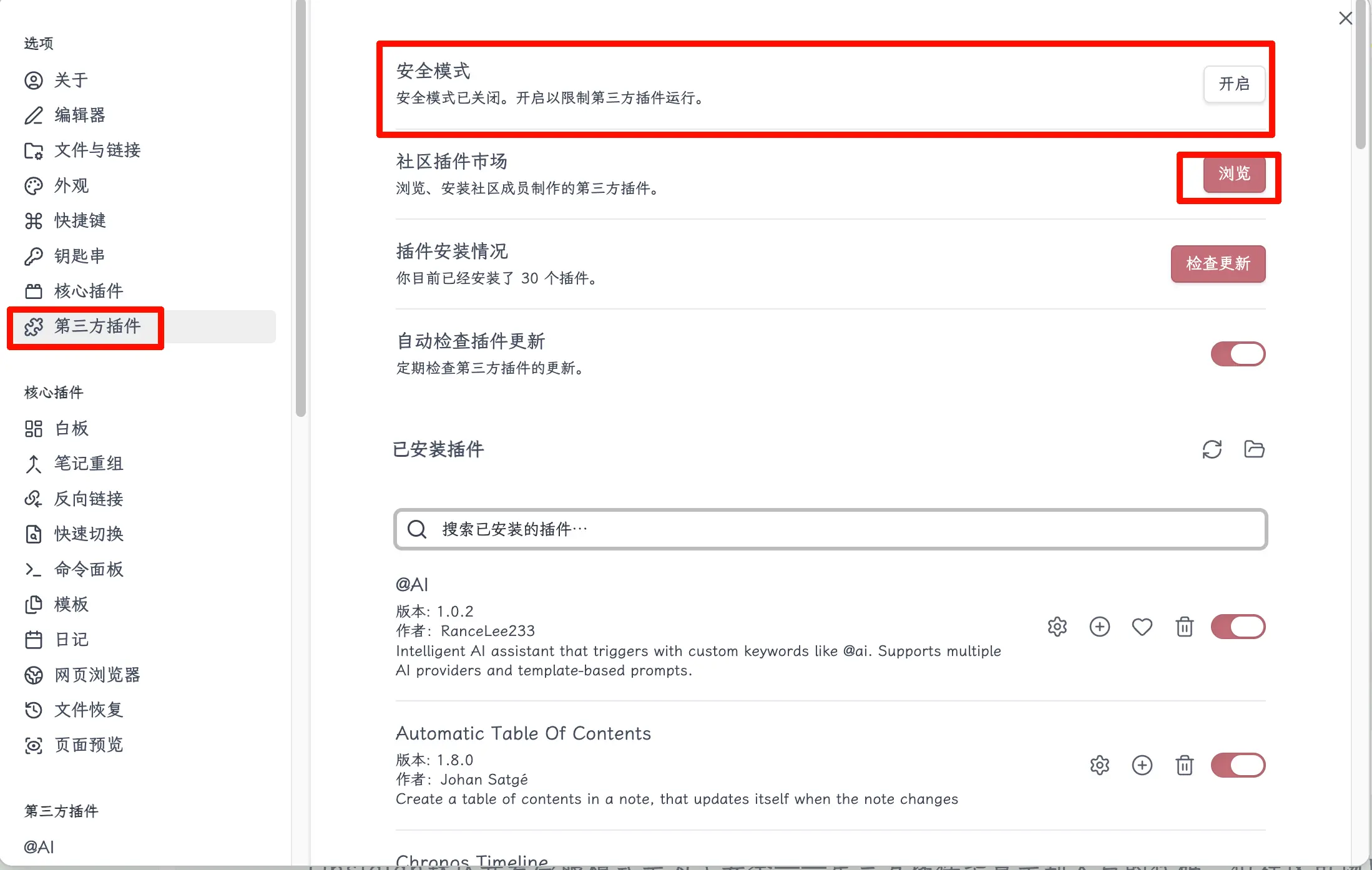 Obsidian默认开着受限模式是为了安全——第三方插件毕竟是别人写的代码。但社区市场里的插件都经过了官方审核,正常使用没问题。