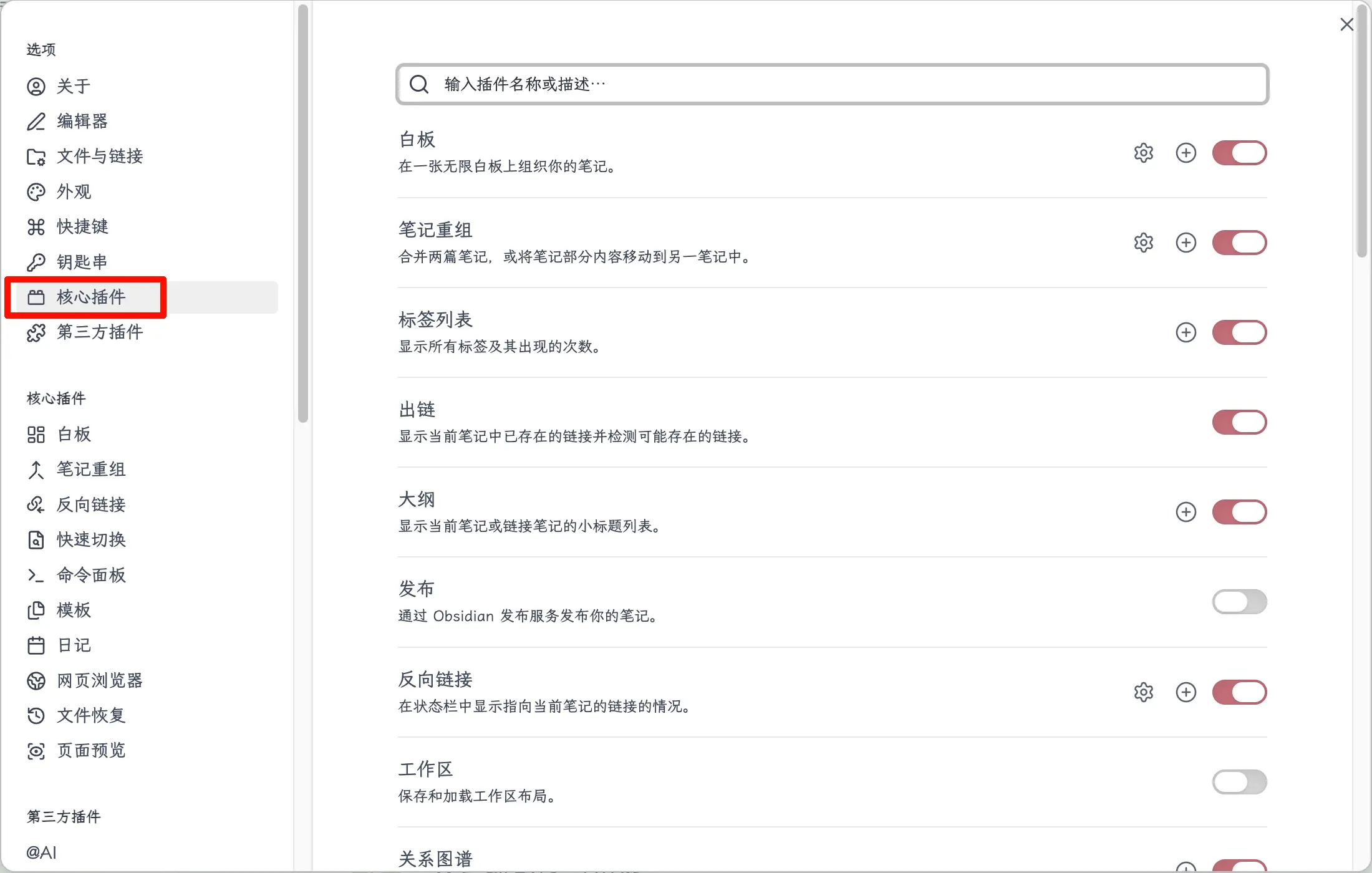 核心插件是Obsidian官方自带的。打开 设置 → 核心插件 就能看到一个列表。
