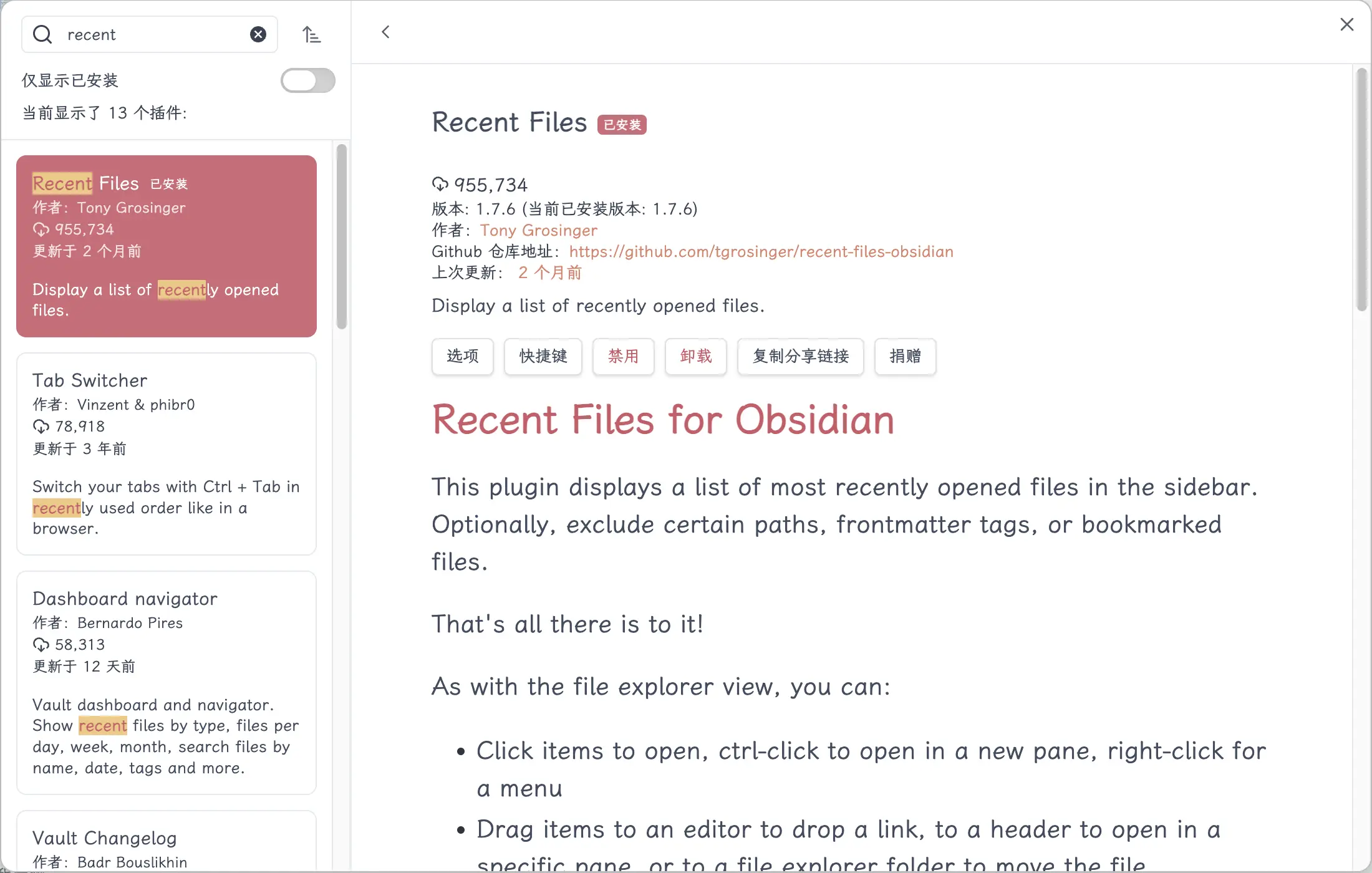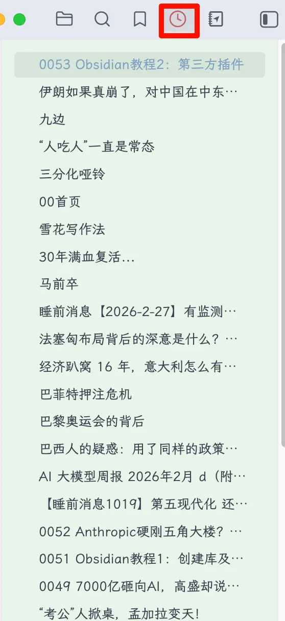 Obsidian默认没有"最近文件"列表。笔记多了以后,找刚才编辑过的文件要在文件夹里翻来翻去。