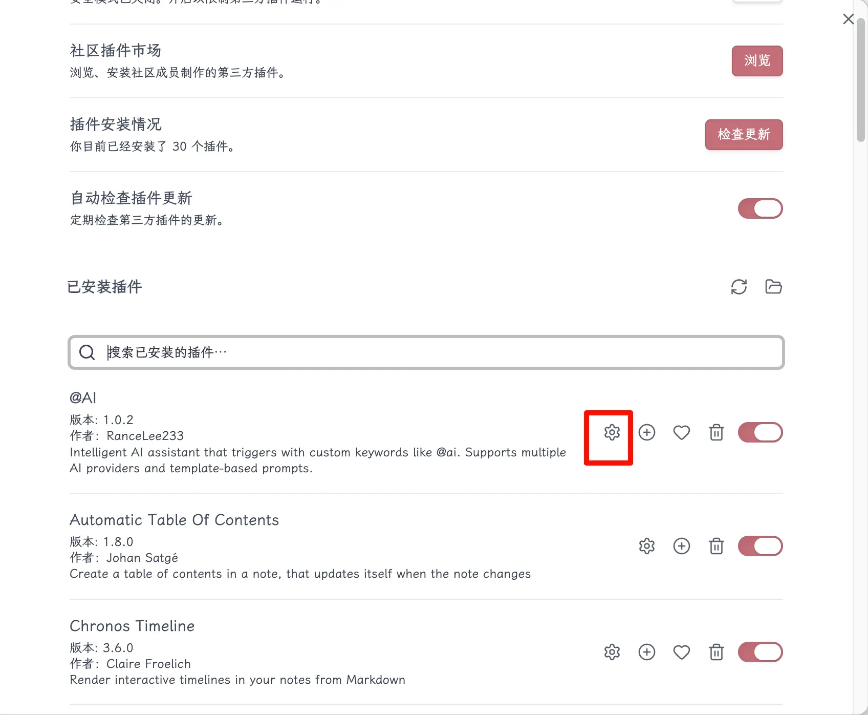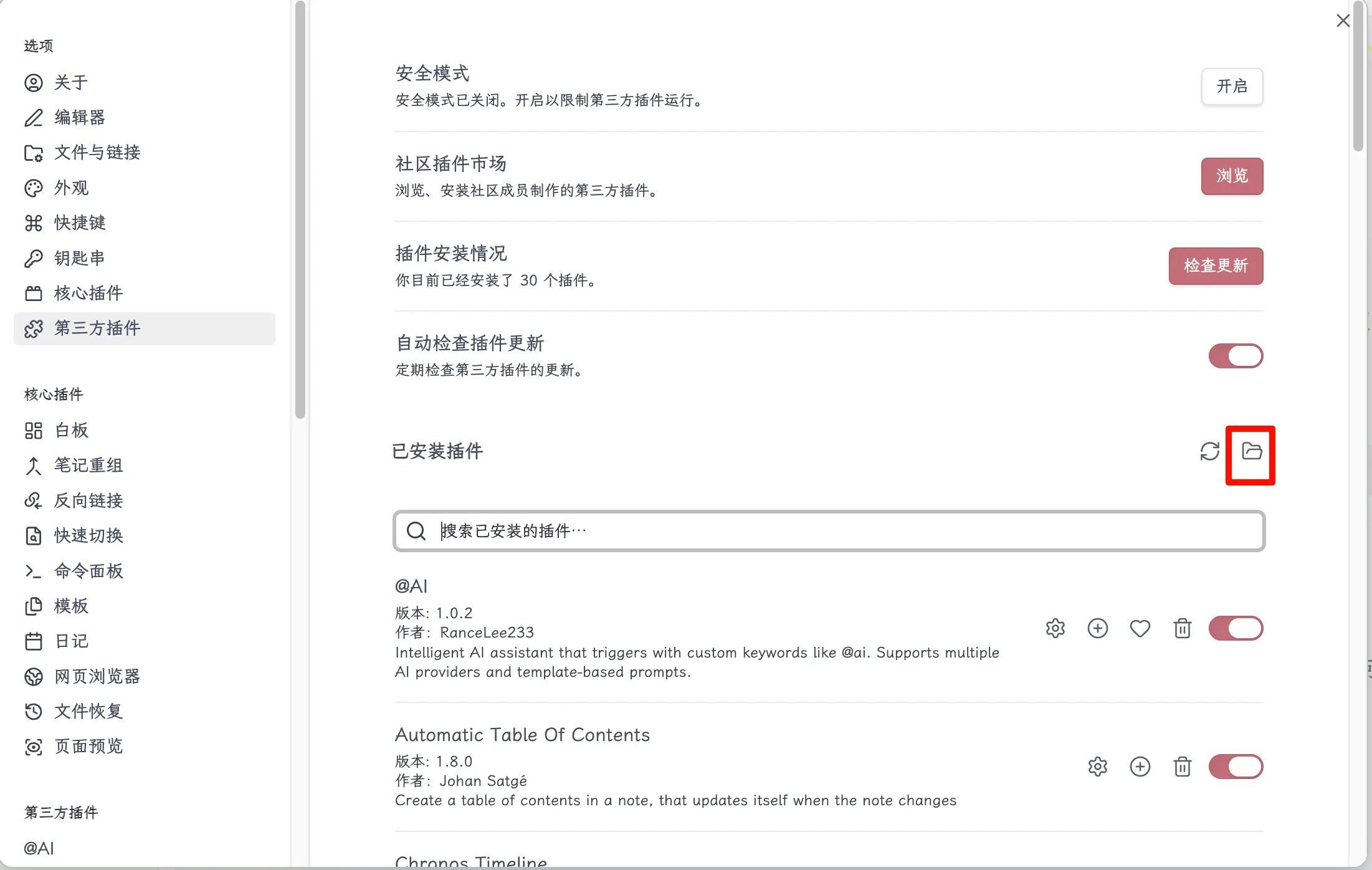 回到Obsidian,设置 → 第三方插件,刷新一下,刚放进去的插件就出现了。打开开关即可。