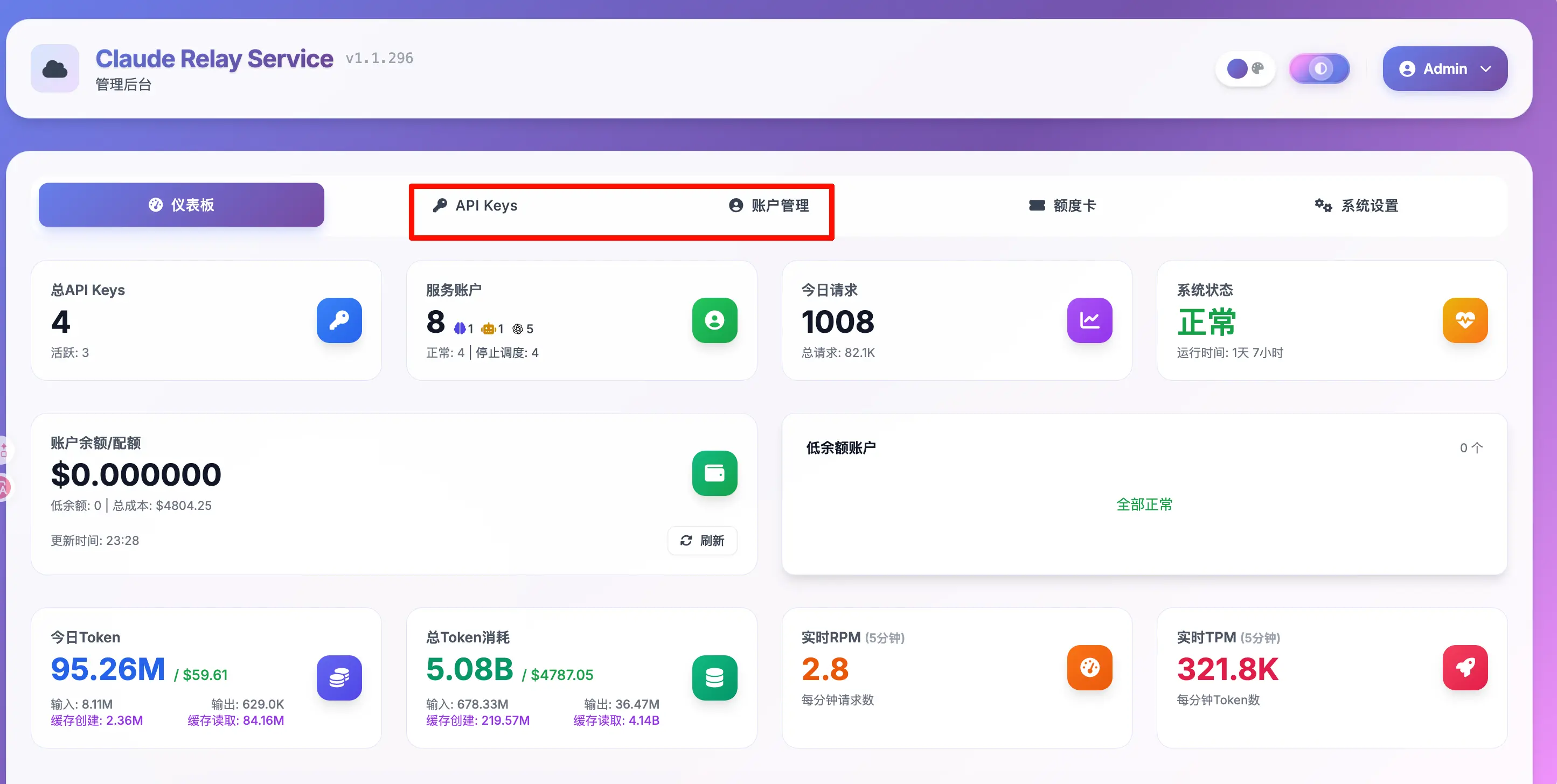 这是系统的仪表板,可以看到当前的API Key数量、服务账户、今日请求量、Token消耗等信息。后台还支持查看每个API Key各自的用量明细,多人共用的时候谁用了多少一目了然,自己探索一下就能找到。