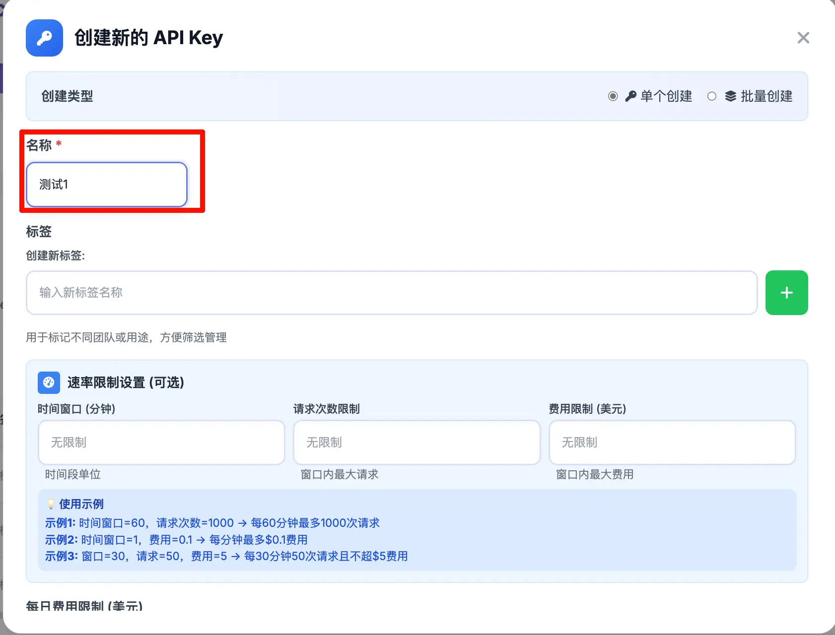 - 速率限制设置(可选):如果是多人共用,可以在这里设置每个Key的请求频率和费用上限。不填就是无限制