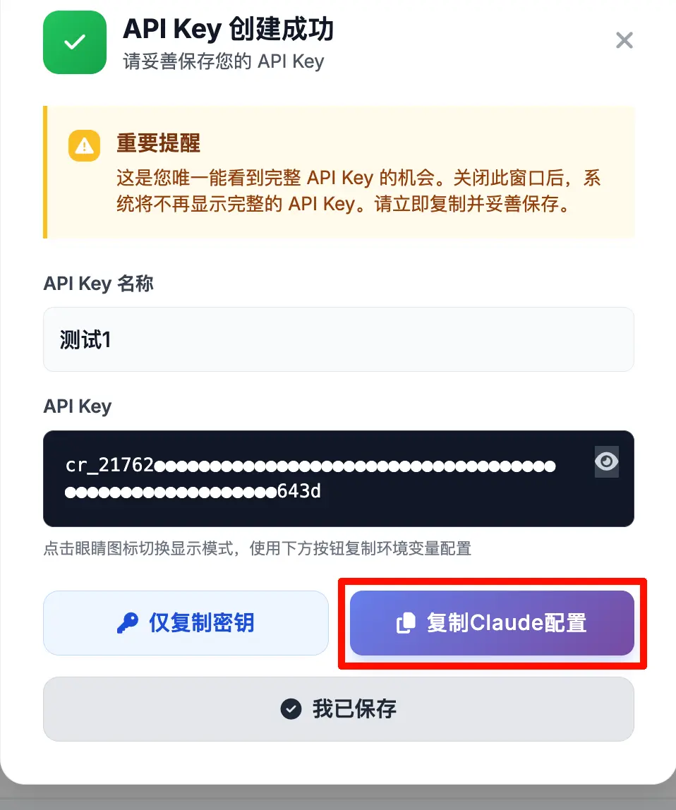 注意这里的重要提醒:这是你唯一能看到完整API Key的机会,关闭这个窗口之后系统就不再显示了。