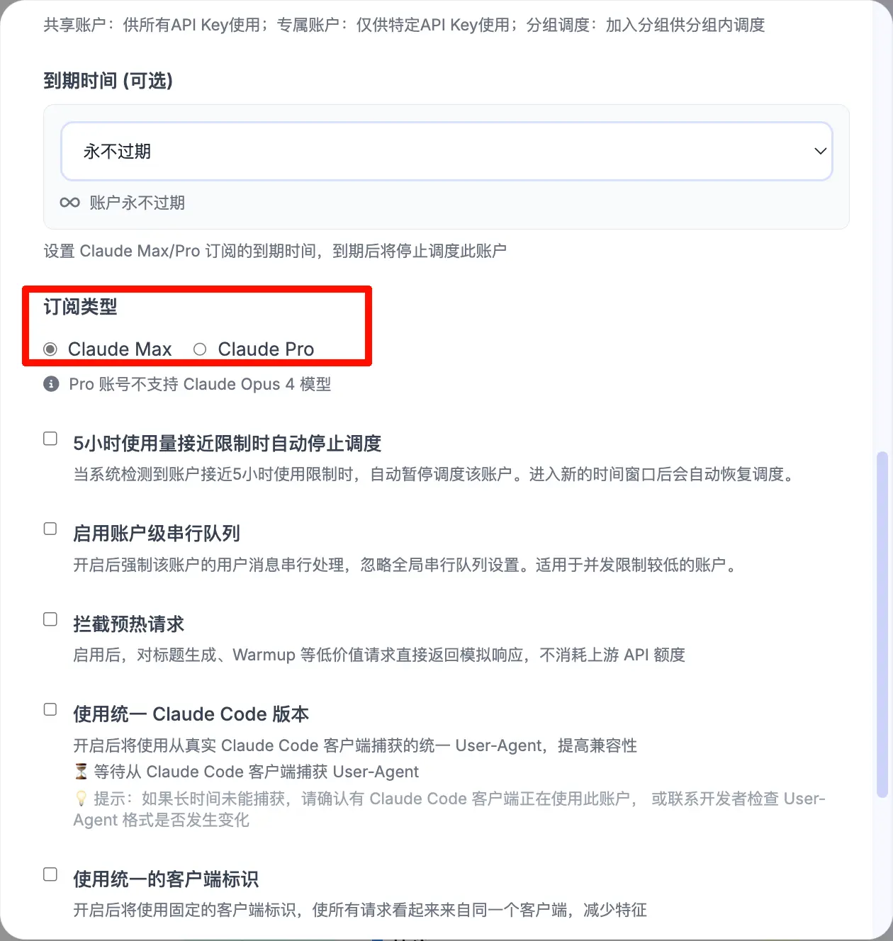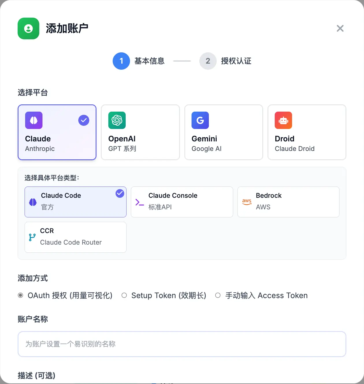 - 账户绑定流程:账户管理→新增账户→选Claude→选订阅类型→OAuth授权