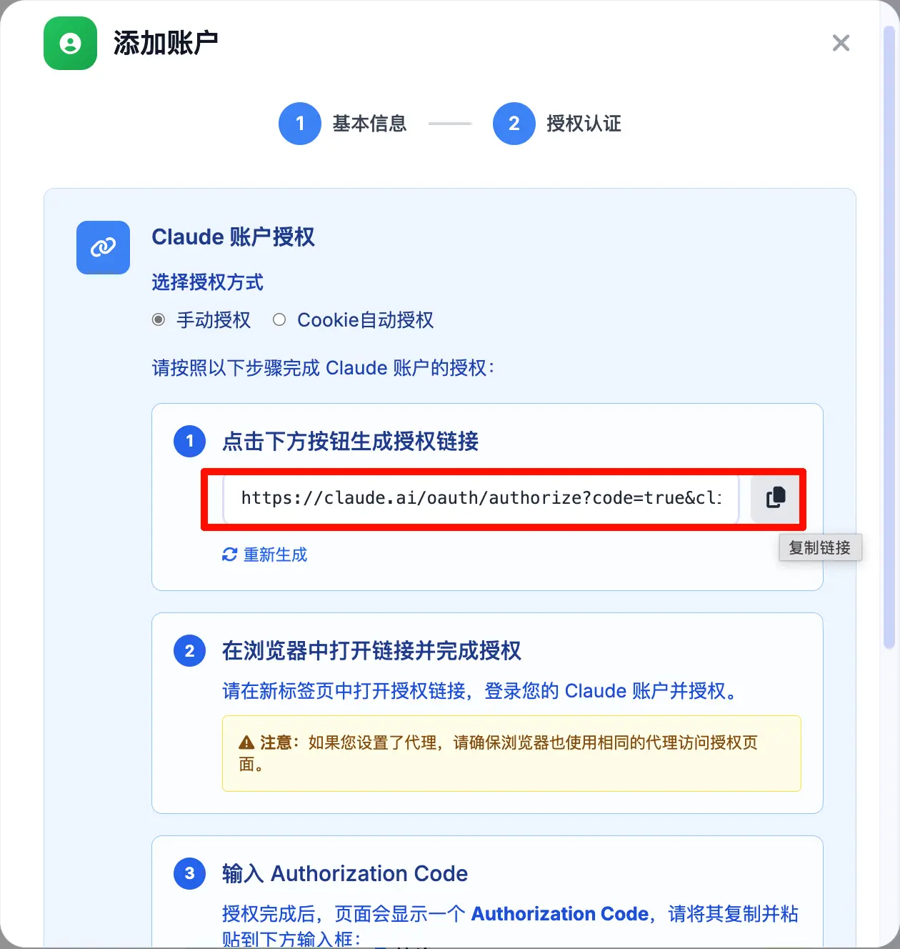这一步是把你的Claude账号授权给这个中转服务。点击"生成授权链接“按钮: