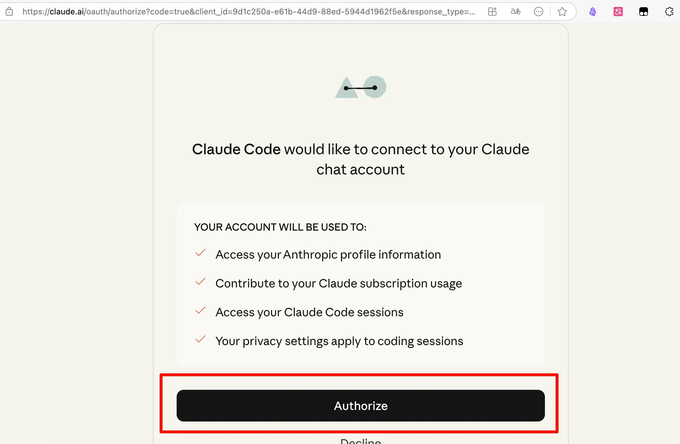 页面会显示"Claude Code would like to connect to your Claude chat account”,点击 Authorize 按钮完成授权。